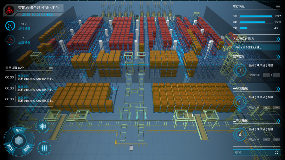 研究所承担的某单位委托研发项目:智慧仓储三维管控平台系统,该平台将“实体空间”和“虚拟呈现”融合,采集实体生产制造及物流设备的实时数据,将企业的生产过程、设备运行情况、质量跟踪状态实时虚拟化;并在虚拟环境中跨各种数据集成展示,完成实体信息、经营管理、生产流程数据的无缝结合,达到信息充分共享,有利于实时监控防范损失、减少开支,提高生产效率, 实现企业车间生产过程的可视化实时监控,为企业打造“智慧型生产工厂”奠定基础。智能仓储全息可视化管理平台实现动态采集、监控数据,能将复杂的厂房、设备各项指标都能完整呈现,不仅能满足实时监控的需求,通过监控设备运行还能有针对性地进行维保计划,避免不必要的工序,提高效率同时降低成本。