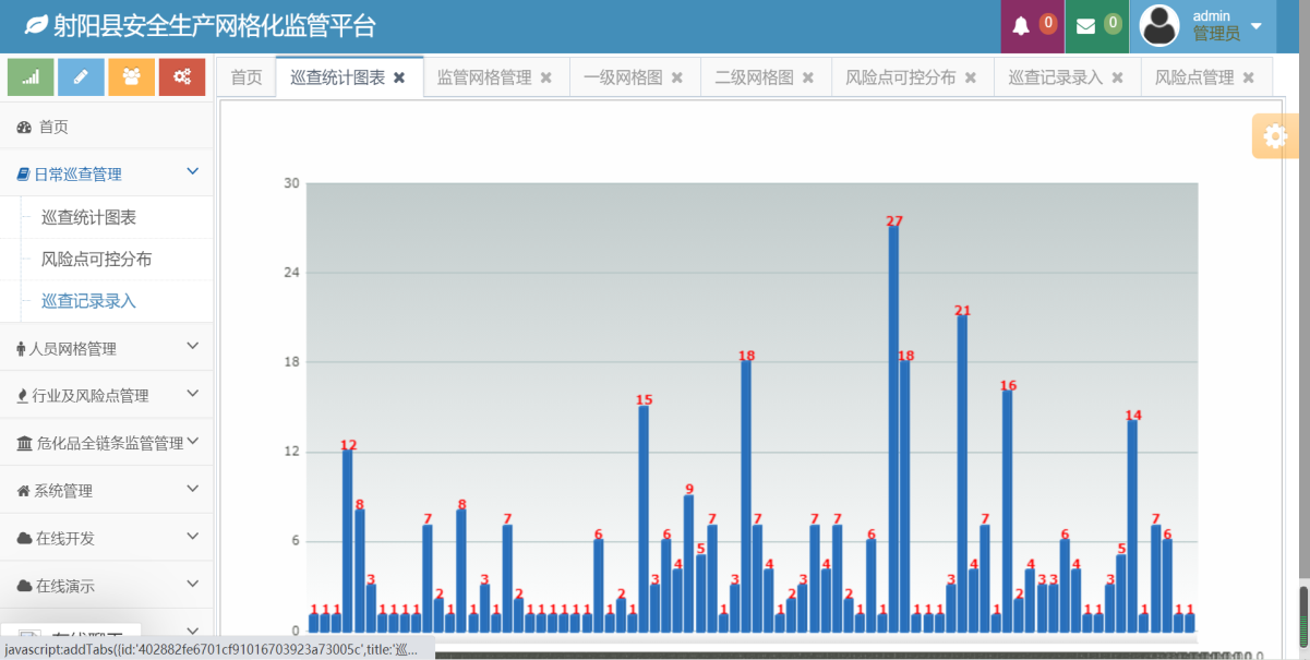 研究所承担的盐城市射阳县应急管理局委托开发项目:网格化应急管理平台系统,该系统能够实现安监部门办公无纸化、安全监管电子化,解决了传统安全监管存在的管理难,监控难等问题。系统主要包括:网格化管理模块、组织结构管理、巡查记录录入与管理、行业及属地管理、数据可视化等。该系统被成功应用于盐城市射阳县应急管理局,提供了一套完善的安全监管、人员管理解决方案。