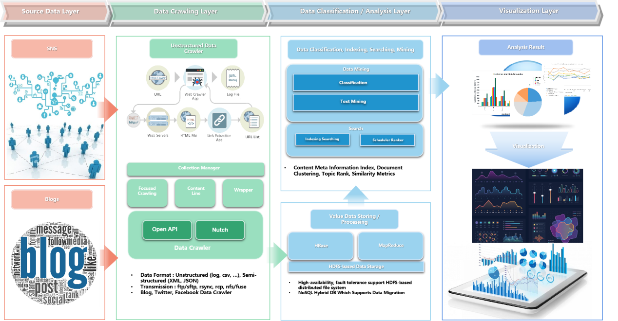 基于Hadoop生态系统的大数据处理技术:以Hadoop分布式文件处理系统为基础,搭载HBase、Hive、Spark、Flink、Kafka等数据存储、处理、消息传递工具,形成大数据处理框架,为海量的结构化、非结构化数据的处理建立了硬件及软件环境。在分布式数据处理框架下通过数据爬取、大规模数据批量\实时分析、数据信息表示,可以提供大量视频数据分布式处理功能为纽带的视频流媒体服务,大规模数据信息中的知识抽取服务,以及依据用户需求的大数据分析服务。