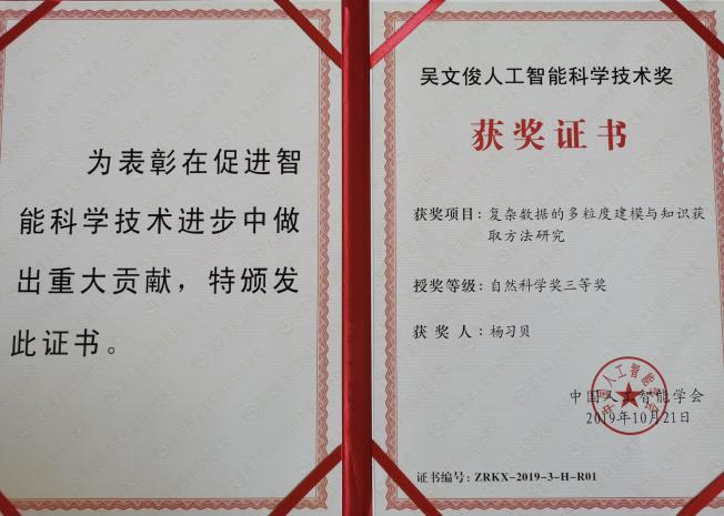 科研获奖方面,本所的代表性成果—复杂数据的多粒度建模与知识获取方法研究,为江苏科技大学首次获得“国内人工智能领域的最高荣誉象征”——吴文俊人工智能科学技术奖自然科学奖,且江苏科技大学为唯一完成单位。本成果面向大规模复杂数据的知识发现研究工作,构建了一个基于多粒度思维的理论与方法体系,不仅改变了传统的计算观念,使得数据的处理更科学、合理、经济和易操作,为大规模复杂数据的知识获取提供了新的解决方案。本成果对政府、金融、医疗、教育、能源等诸多应用领域的进步与发展起到积极的推动作用,受到了国内外众多知名学者的高度认同。