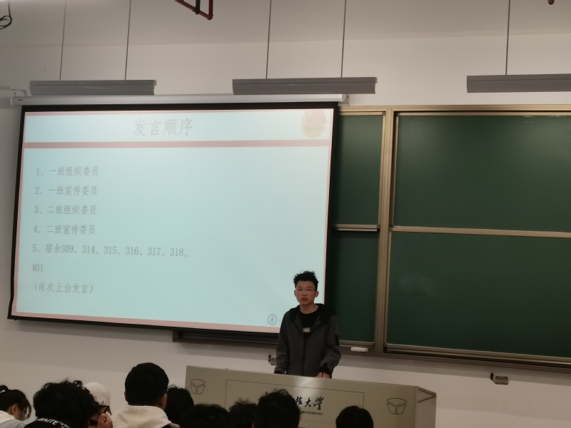 为进一步加强先进模范的正面示范作用,同时完善以宿舍为单位的网格化管理模式,推进团支部成员学习生活更优化,各宿舍分别派代表进行了近期的学习生活总结并进行自我剖析。309宿舍作为优秀宿舍代表首先进行学习生活总结,王艺霖同学不仅分享了在各课程上的一些学习方法,也展示了宿舍良好的生活风气。