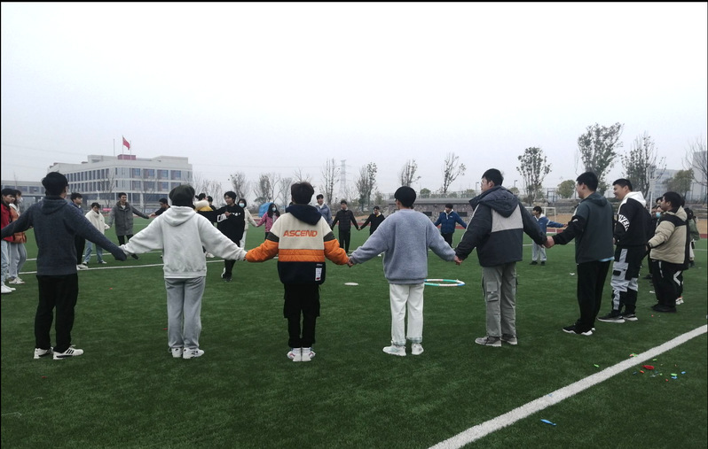 随着时间的推移,游戏来到了尾声。“马兰花,马兰花,风吹雨打都不怕,请问要开几朵花?”随着主持人一声令下,同学们迅速抱团。游戏虽然简单,却能让同学们更快的消除彼此之间的陌生感。