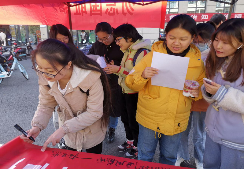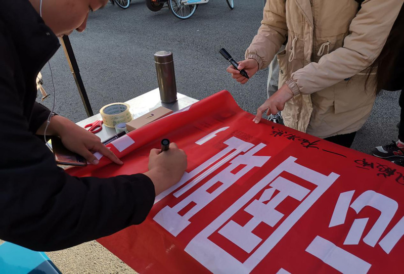活动开始,青协成员简要介绍国家公祭日背景和设立意义,向同学们科普相关知识。随后同学们通过“网上烛光祭”参与答题、点烛和选择寄语等环节进行互动,并运用微信朋友圈纪念打卡。以此达到学习历史知识的同时,纪念南京大屠杀遇难者同胞、祈愿和平的目的。最后,邀请同学们在横幅上签字或写寄语,共同缅怀遇难的30万同胞,牢记中华民族的苦难岁月。