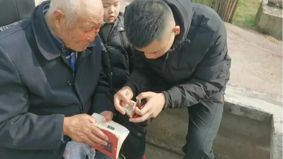 采访队员来到罗爷爷家里时,罗爷爷正在看书,见到队员的到来,罗爷爷很高兴,激动的起身迎接队员们,范同学急忙上前搀扶住罗爷爷,让罗爷爷坐回椅子上,开始采访之前,队员们为罗爷爷送上亲切问候。