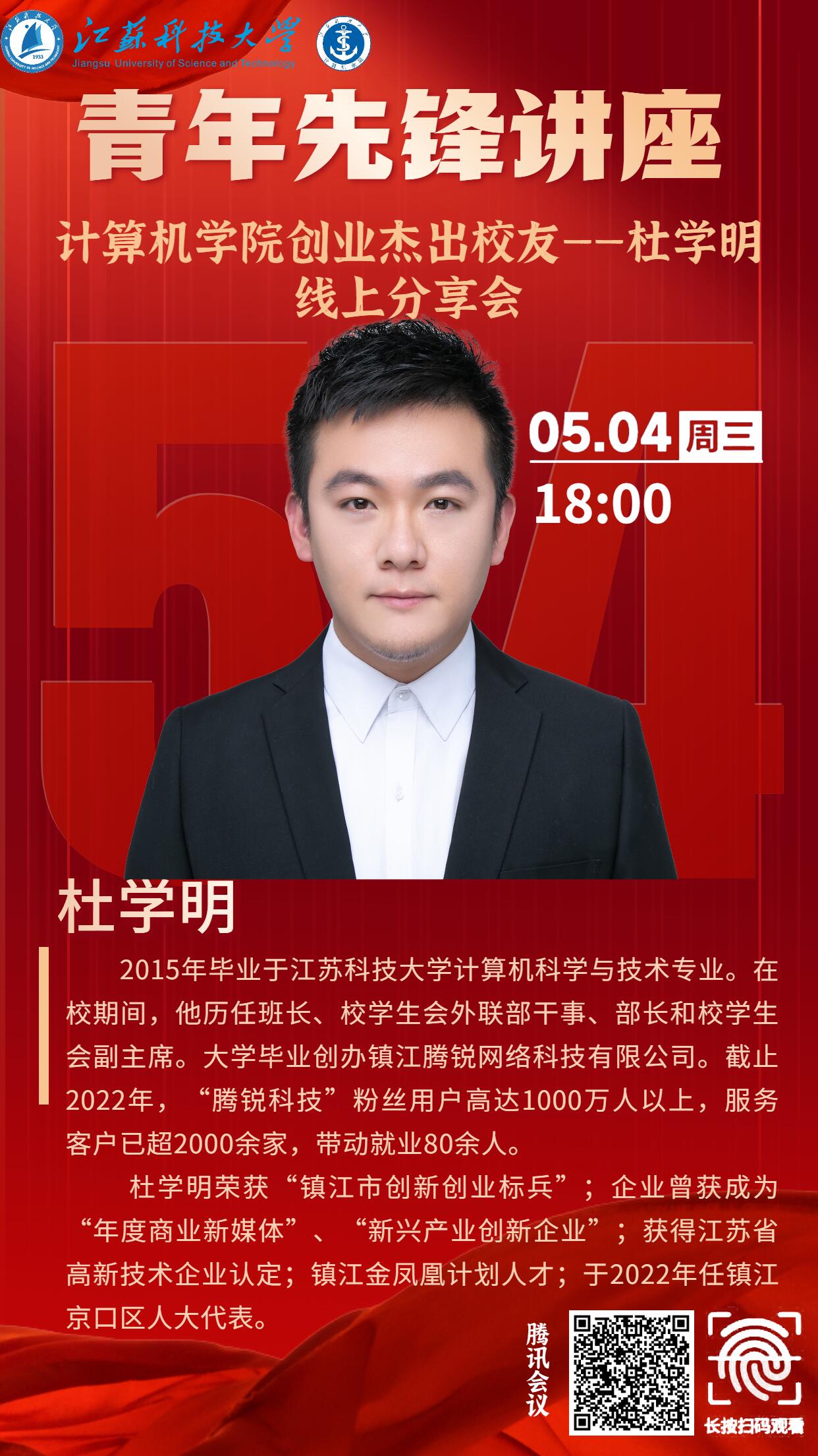 晚上18:00,计算机学院邀请到了江苏科技大学创业杰出校友杜学明,为同学们讲述本科生毕业后创业的经历,分享创业成功的经验和心得体会,也为同学们解答对于创业相关的疑惑。