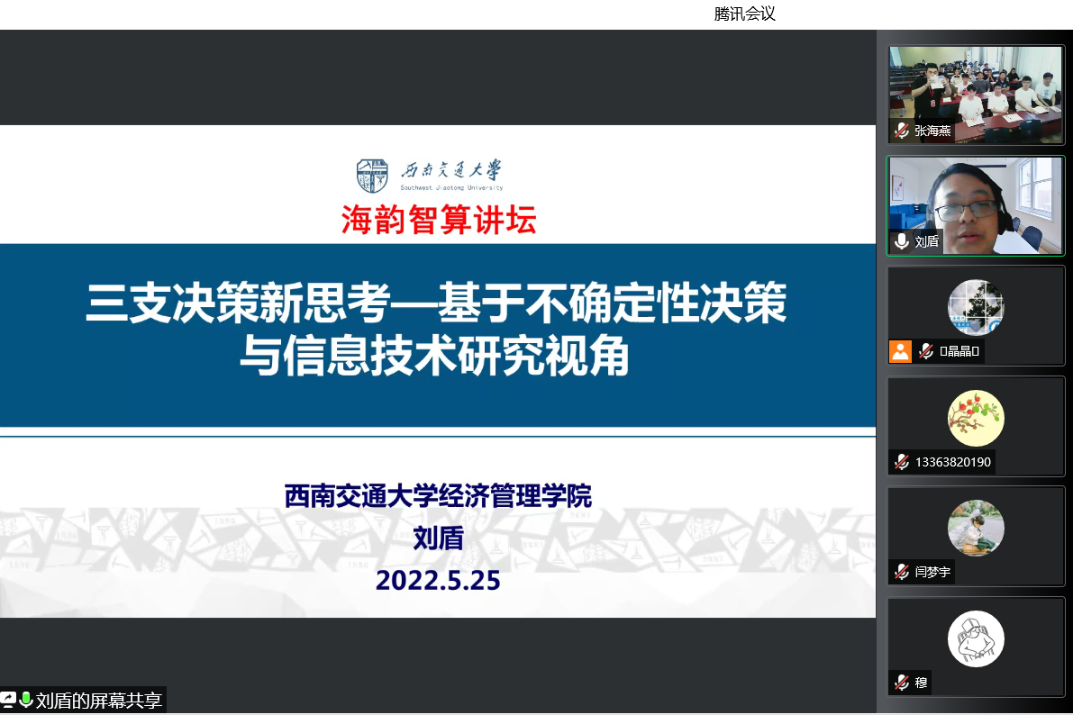 5月25日下午2点,西南交通大学刘盾教授应邀为计算机学院师生作了题为“三支决策新思考—基于不确定性决策与信息技术研究视角”的学术报告。本次报告会采用线上线下混合方式进行,报告会由我院副院长杨习贝主持。计算机学院领导、部分教师及研究生在计算机学院320聆听了讲座。
