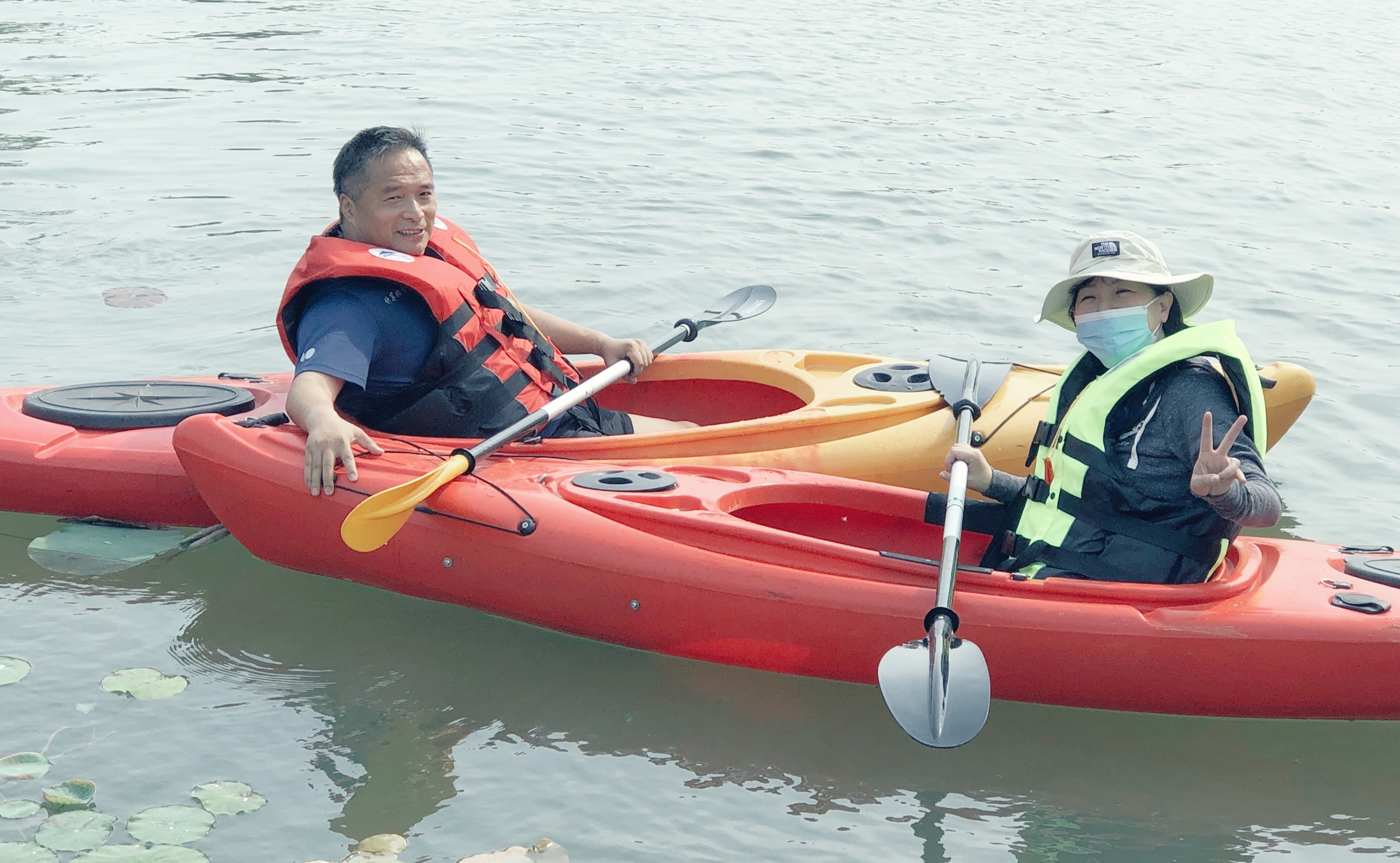 老师们虽然很多是第一次体验皮划艇,但在专业游泳救生员的保护及指导下很快就找到感觉,开始展现各自矫健的身姿,奋楫前行,整个湖上洋溢着欢声笑语。在活动过程中,大家互相交流经验、心得体会,欣赏湖中美丽风景,在学到水上运动知识和技能的同时还增进了感情。