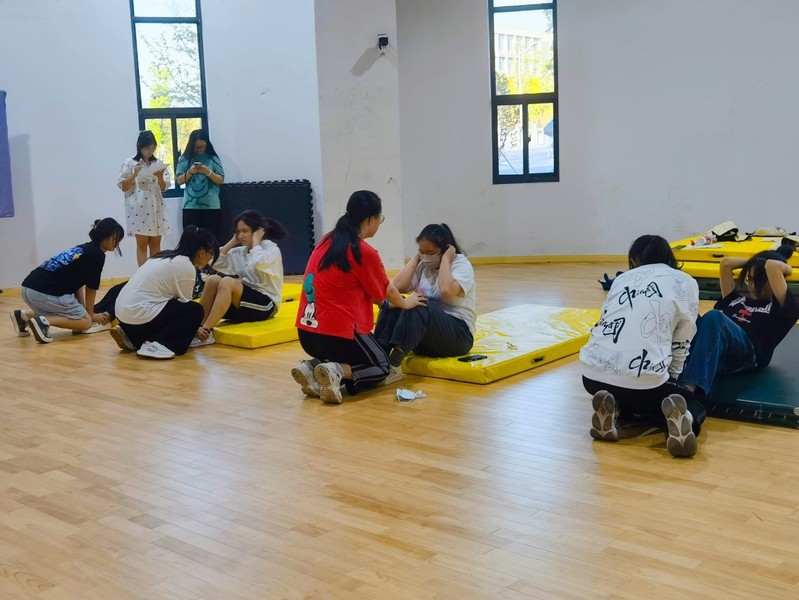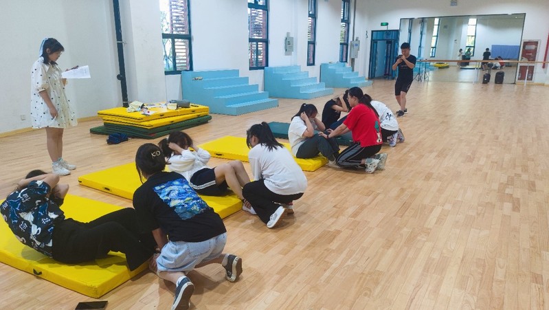 在长山校区文体中心的健美操房进行了体育项目女子团体仰卧起坐的参赛人员选拔。