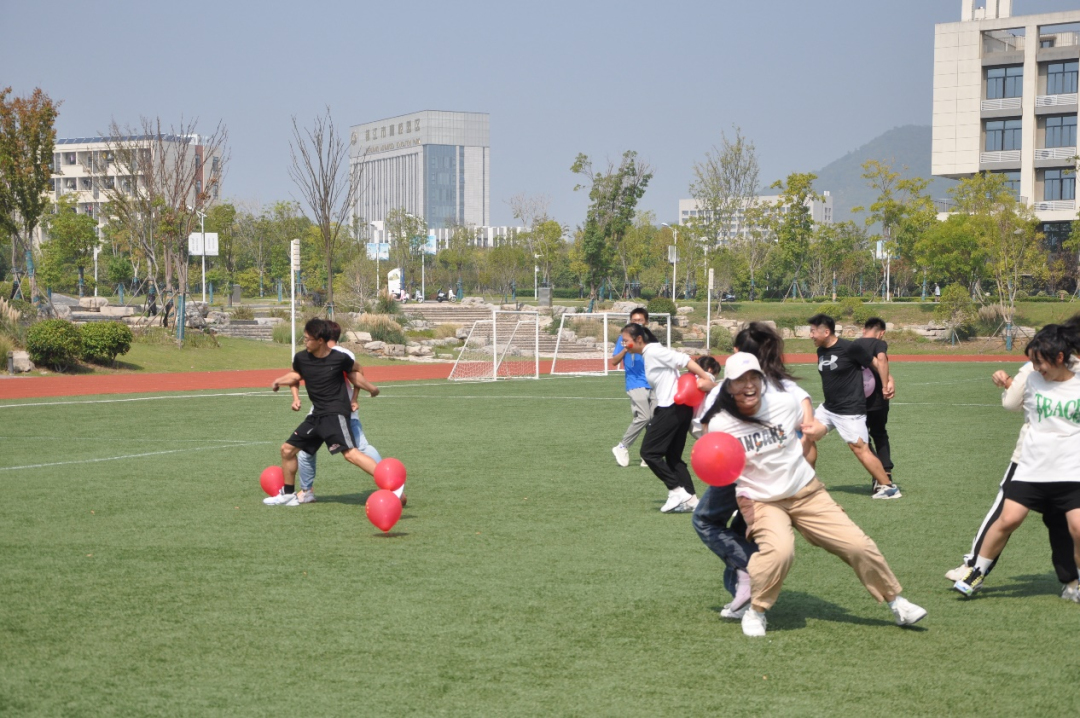 各小队成员以2人为单位,背靠背夹着气球,向终点冲刺。