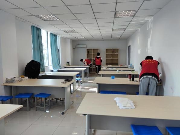 在自习室等公共区域,志愿者们进行了卫生清扫,将杂物规范摆放至置物柜,并对插排断电处理,对杂物进行了整理,为同学们创建安全、卫生的公共空间。