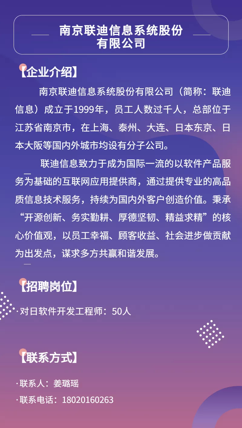 “爱英之旅”2022-2023年江苏重点软件企业全国校园行,江苏科技大学站诚邀您于10月21日14:00到江苏科技大学长山校区图书馆309参加南京壹进制信息,南京联迪信息,南京软通动力等多家重点软件企业(具体企业明细如下)带着offer等您来!