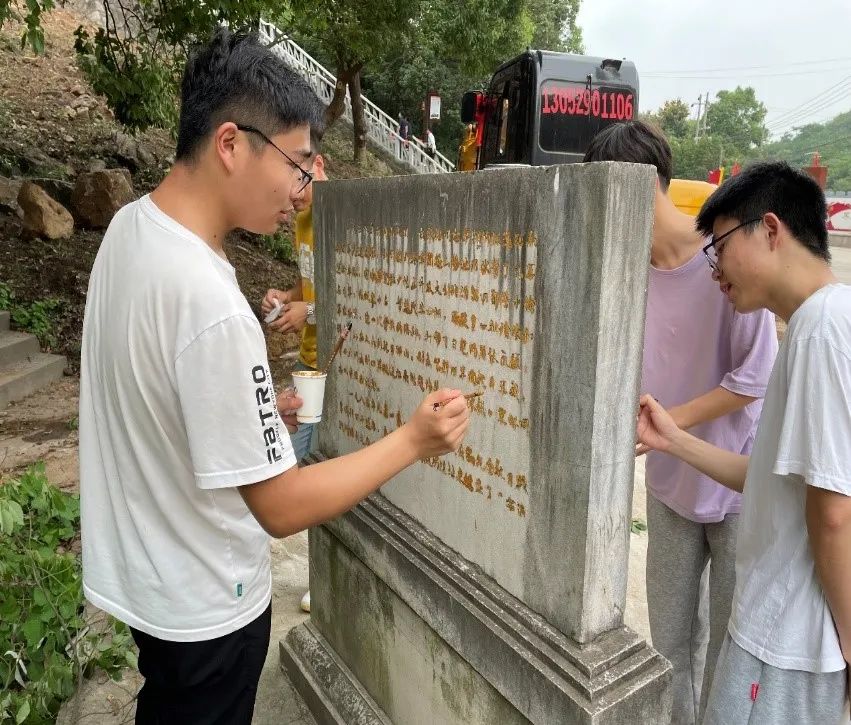 参观韦岗战斗纪念碑时,同学们发现部分碑文上漆面褪色,在寻求馆长帮助后,借来金漆、毛笔等工具,开始如火如荼地修复工作。