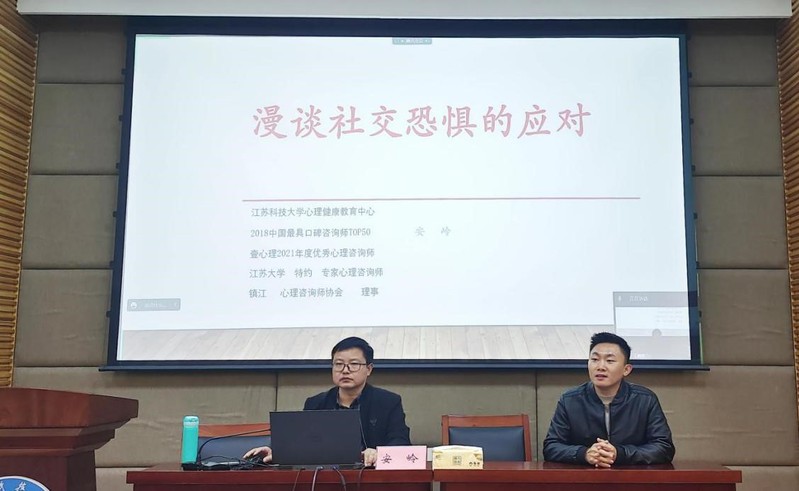 11月4日下午15:30,江苏科技大学心理健康教育中心、赢博官方网站,赢博yingbo(中国)“心理健康辅导工作室”在图书馆B101开展“向阳携行,共创未来”心理健康教育讲座。本次讲座通过“线上+线下”双平台,邀请校心理健康教育中心专职教师安玲老师进行《漫谈社交恐惧症的应对》主题宣讲,旨在帮助同学们认识到什么是社交恐惧症,正确的认识社交恐惧症,帮助同学们战胜社交恐惧,消除社交紧张,建立良好的人际交往。会议由计算机学院心理辅导员刘宝达老师主持,学院各专业各班级同学近100人参与。会议开始由刘宝达老师简述本次的讲座内容,并且隆重的介绍本次的主讲人安玲老师,大家对安玲老师表示热烈的欢迎。