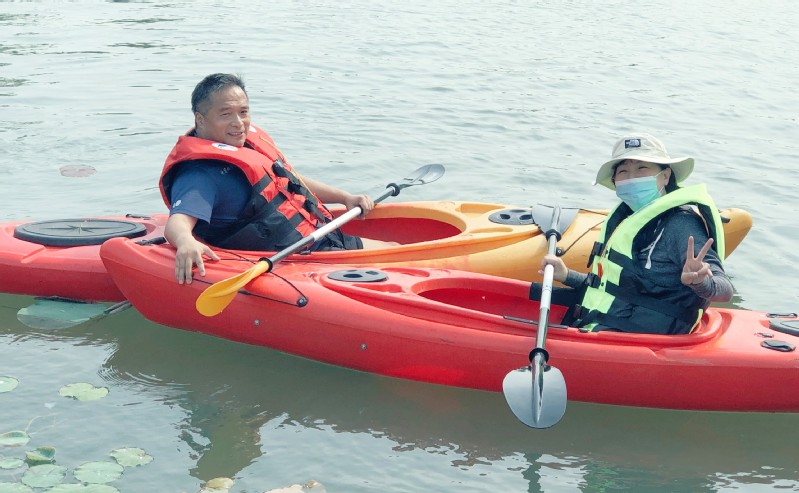 老师们虽然很多是第一次体验皮划艇艇,但在专业游泳救生员的保护及指导下很快就找到感觉,开始展现各自矫健的身姿,奋楫前行,整个湖上洋溢着欢声笑语。在活动过程中,大家互相交流经验、心得体会,欣赏湖中美丽风景,在学到水上运动知识和技能的同时还增进了感情。