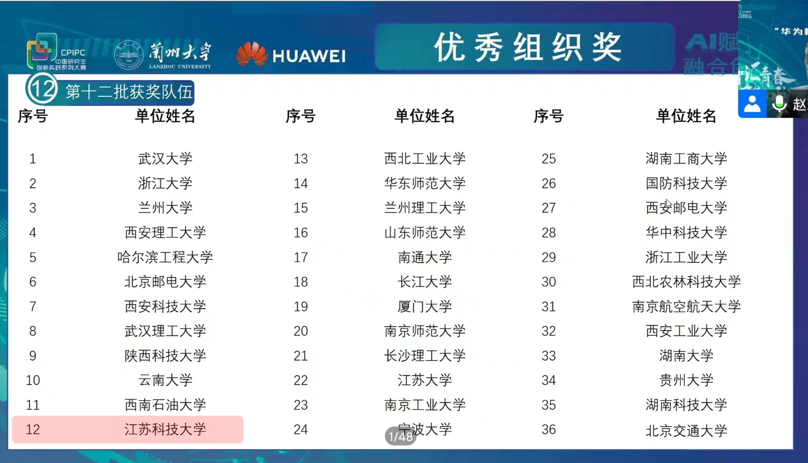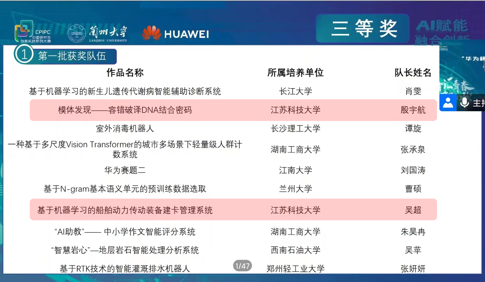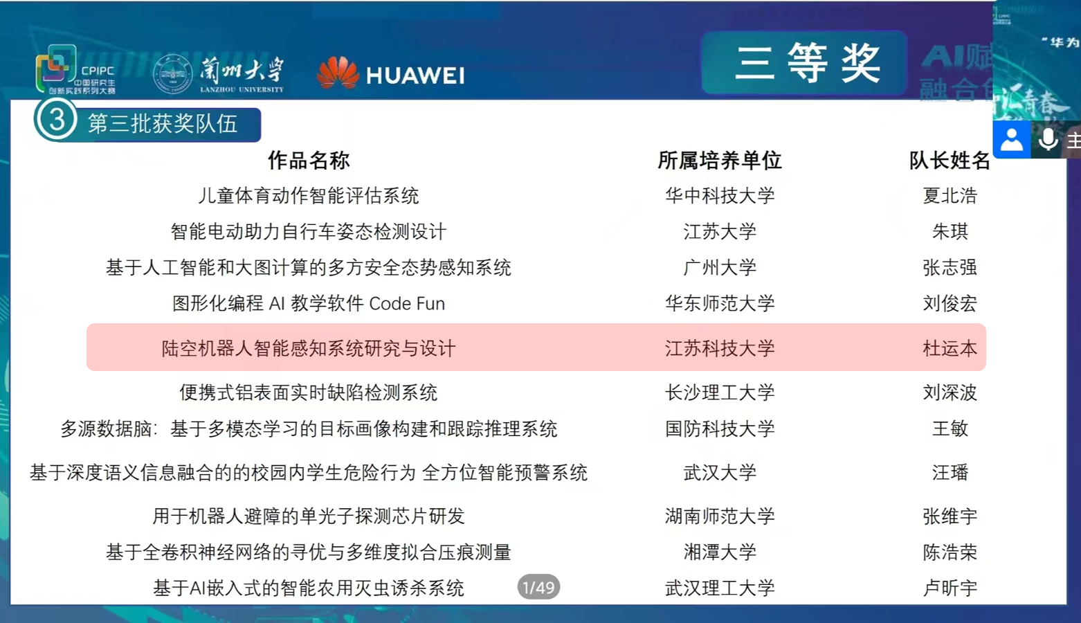 12月10日,由教育部学位管理与研究生教育司指导,中国学位与研究生教育学会、中国科协青少年科技中心主办,兰州大学承办的“华为杯”第四届中国研究生人工智能创新大赛全国决赛在甘肃兰州举办。经过激烈角逐,我校学子获国家级奖项3项,实现历史性突破。获奖项目分别是:由教师高尚指导、殷宇航等完成的《模体发现——容错破译DNA结合密码》,由教师李炳强、刘金锋指导,吴超等完成《基于机器学习的船舶动力传动装备建卡管理系统》,由教师仲伟波、於跃成指导,杜运本等完成的《陆空机器人智能感知系统研究与设计》。
