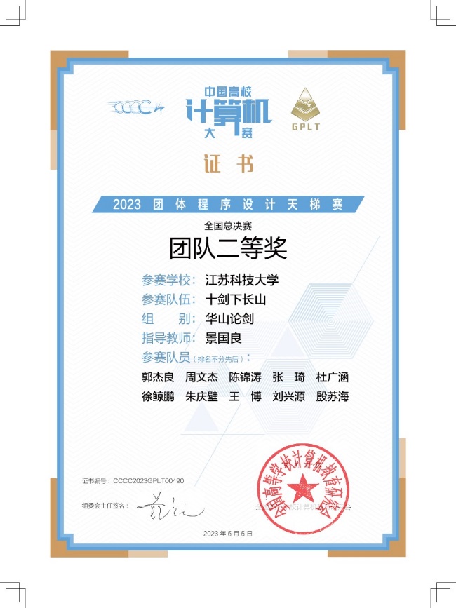 近日,第八届中国高校计算机团体程序设计天梯赛全国总决赛落下帷幕。来自全国31个省份的480所高校组成的1624支队伍共16167位学生同场竞技,双一流高校悉数参加。我校由计算机学院郭杰良、周文杰、陈锦涛、张琦、杜广涵、徐鲸鹏、朱庆壁、王博、刘兴源、殷苏海10名同学组成的“十剑下长山”代表队在教练景国良老师指导和带领下戒骄戒躁,勇于拼搏,最终勇夺全国总决赛银奖,并首次获得江苏省金奖。