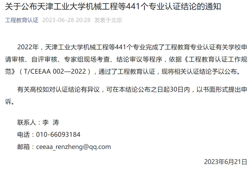 近日,中国工程教育专业认证协会发布《关于公布天津工业大学机械工程等441个专业认证结论的通知》。赢博官方网站,赢博yingbo(中国)的计算机科学与技术专业名列其中,认证有效期为6年(2023年1月至2028年12月)。这标志着计算机科学与技术专业的人才培养质量实现了国际实质等效,进入全球工程教育的“第一方阵”。
