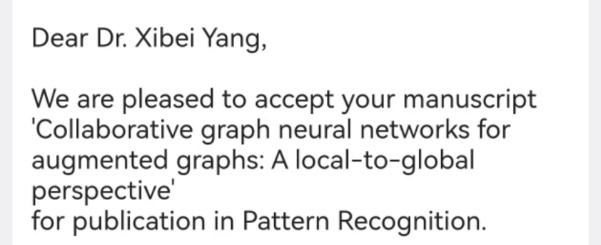 近日,我院杨习贝教授指导的博士研究生郭启航在图神经网络领域取得重要进展,其研究工作“Collaborative graph neural networks for augmented graphs: A local-to-global perspective”被模式识别顶级期刊《Pattern Recognition》(中科院JCR一区Top期刊,CCF/CAAI B类期刊)录用,江苏科技大学为第一署名单位,是我院在该领域影响力最高的论文之一。