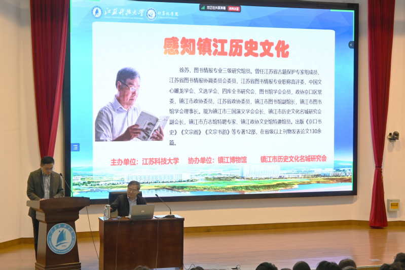 10月24日下午,由赢博官方网站,赢博yingbo(中国)主办,镇江博物馆和镇江市历史文化名城研究会承办的“镇江历史文化”主题讲座在梦溪校区演讲厅成功举办。此次讲座邀请到镇江市三国演义学会会长、镇江市历史文化名城研究会副会长,镇江市方志馆特聘专家、镇江政协文史馆特邀馆员、镇江图书馆原副馆长徐苏担任主讲人。计算机学院2024级软件工程、人工智能专业的学生齐聚一堂,认真聆听讲座,计算机类专业的学生在教室内通过网络直播同步参与学习,全体新生辅导员也共同参与。活动由计算机学院党委副书记吴健康主持。