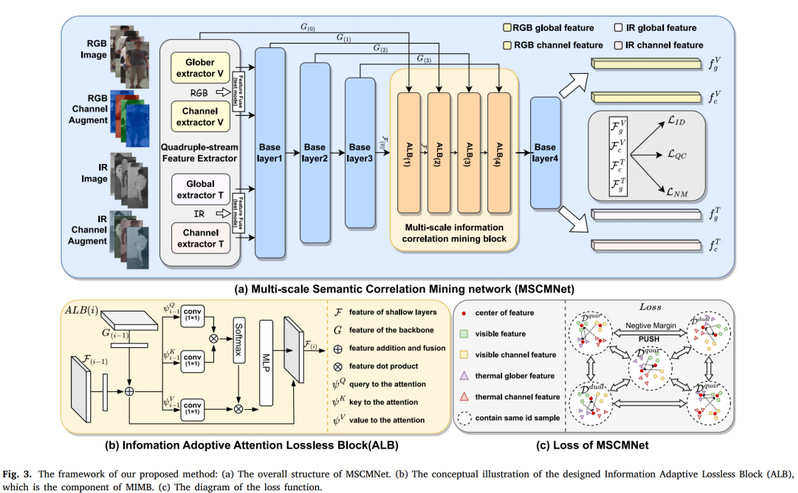 为了充分挖掘RGB-IR的模态信息,研究提出了基于深度学习的多尺度语义关联挖掘网络MSCMNet。通过设计多尺度信息关联挖掘块 (MIMB) 探索融合特征的隐含语义关联,并设计四流特征提取器 (QFE) 尽可能保留原始数据的不同的语义信息。最后提出了一种新颖的四中心三元组损失 (QCT) 来处理跨模态特征中的语义信息差异。大量SYSU-MM01、RegDB 和 LLCM 数据集上的实验表明我们提出的 MSCMNet 在 VI-RelD 任务中的表现优于目前其他最先进的方法。