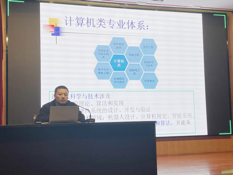 10月31日晚19:00,计算机学院2024级新生转型教育课第四讲在梦溪校区学术报告厅热烈开展。学院计算机科学与技术专业负责人胡春龙老师、计算机协会会长彭羽轩同学受邀担任讲座主讲人。现场气氛热烈,2024级计算机类专业的学生齐聚一堂,认真聆听讲座,软件工程、人工智能专业的学生在教室内通过网络直播同步参与学习,全体新生辅导员共同参加。活动由学院负责新生转型教育课的辅导员张威老师主持。