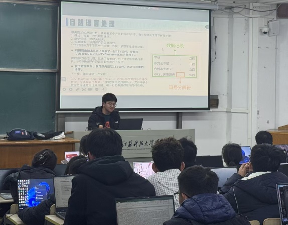 本次培训由会长杜天宇同学担任主讲师,聚焦自然语言处理这一前沿领域。他深入浅出地讲解了自然语言处理的基本概念、应用场景与核心技术,从基础理论层面为同学们筑牢根基。紧接着,杜天宇同学引入实际案例,现场演示如何使用Pycharm 读取CSV 文件构造词袋模型并统计词频,将抽象的知识具象化,让同学们更易理解吸收。