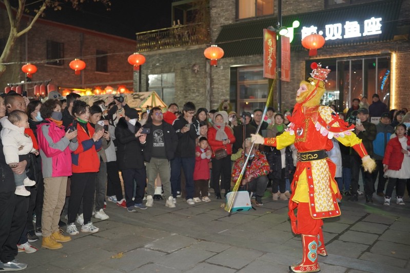 夜幕降临,来自各民族的学生兴奋地在镇江达孜民族交往交流中心点燃了篝火,伴随着粗狂的音乐载歌载舞和游客跳起了西藏锅庄舞。西津大市晚会也如约而至,新疆舞、藏族舞、相声、器乐、孙悟空扮相热辣滚烫,吸引了诸多游客和市民的驻足观看,氛围感拉满!